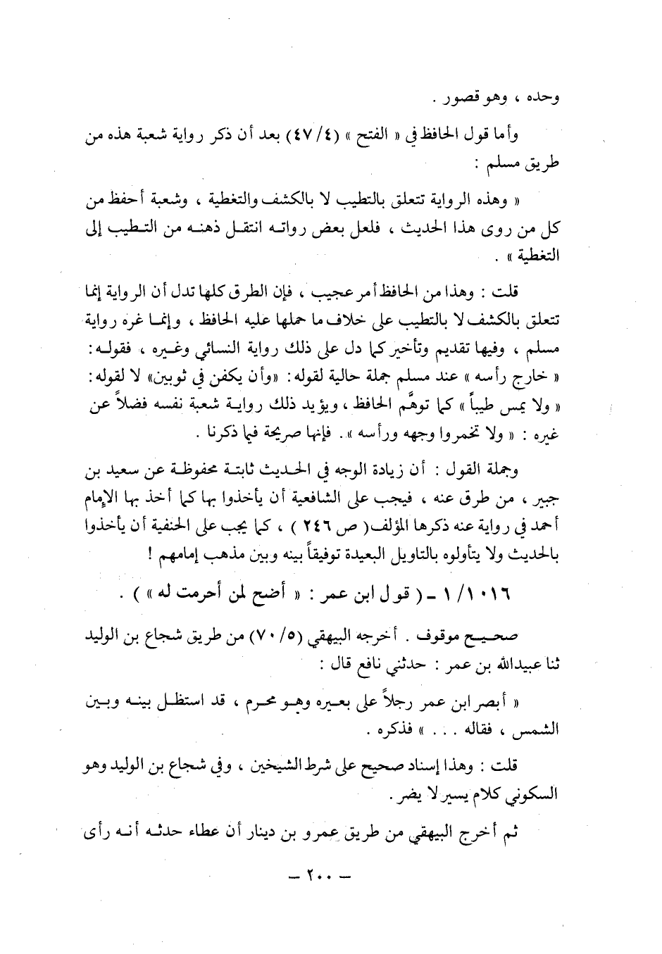 وأما قول الحافظ في " الفتح " (4/47) بعد أن ذكر رواية شعبة هذه من طريق مسلم: وهذه الرواية تتعلق بالتطيب لا بالكشف والتغطية , وشعبة أحفظ من كل من روى هذا الحديث , فلعل بعض رواته انتقل ذهنه من التطيب إلى التغطية.