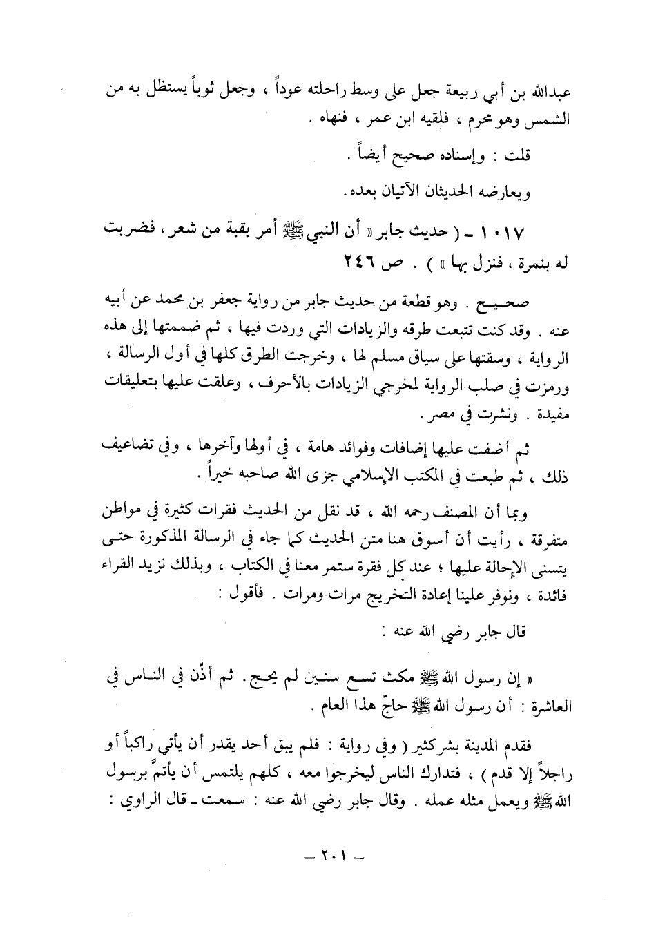(1017) - (حديث جابر (أن النبي صلى الله عليه وسلم امر بقبة من شعر فضربت له بنمرة فنزل بها) . ص 246