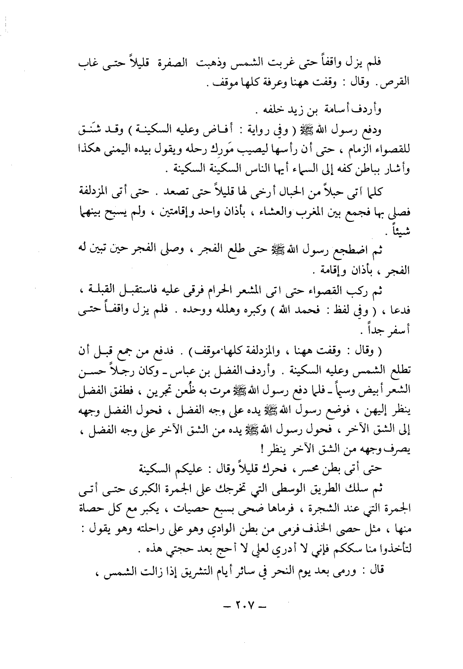 كلما آتى حبلا من الحبال أرخى لها قليلا حتى تصعد. حتى أتى المزدلفة فصلى بها فجمع بين المغرب والعشاء بأذان واحد وإقامتين ولم يسبح بينهما شيئا.