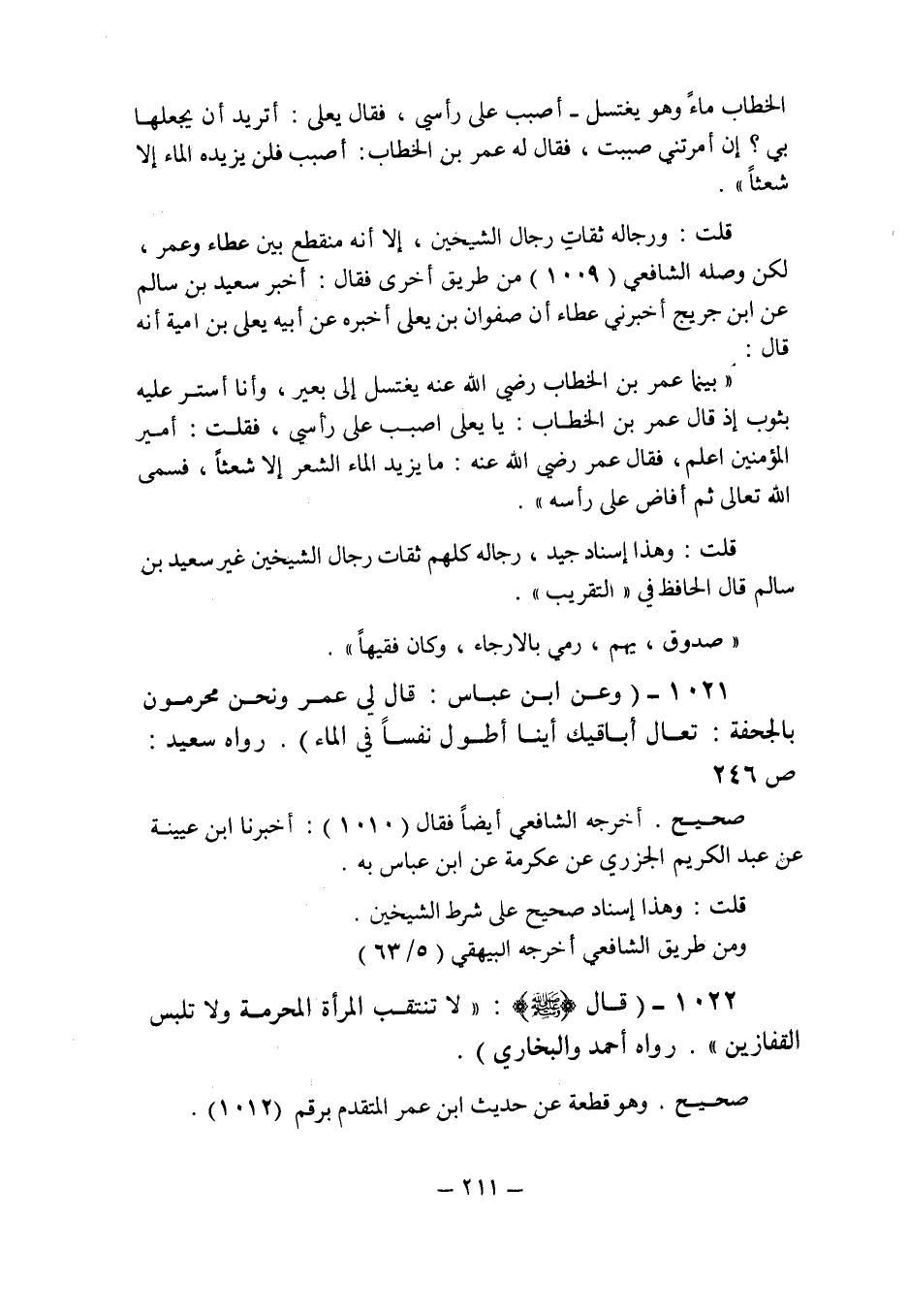 قلت: ورجاله ثقات رجال الشيخين , إلا أنه منقطع بين عطاء وعمر , لكن وصله الشافعى (1009) من طريق أخرى فقال: أخبر سعيد بن سالم عن ابن جريج أخبرنى عطاء أن صفوان بن يعلى أخبره عن أبيه يعلى بن أمية أنه قال: " بينما عمر بن الخطاب رضى الله عنه يغتسل إلى بعير , وأنا أستر عليه بثوب إذ قال عمر بن الخطاب: يا يعلى اصبب على رأسى , فقلت: أمير المؤمين اعلم , فقال عمر رضى الله عنه: ما يزيد الماء الشعر إلا شعثا , فسمى الله تعالى ثم أفاض على رأسه ".