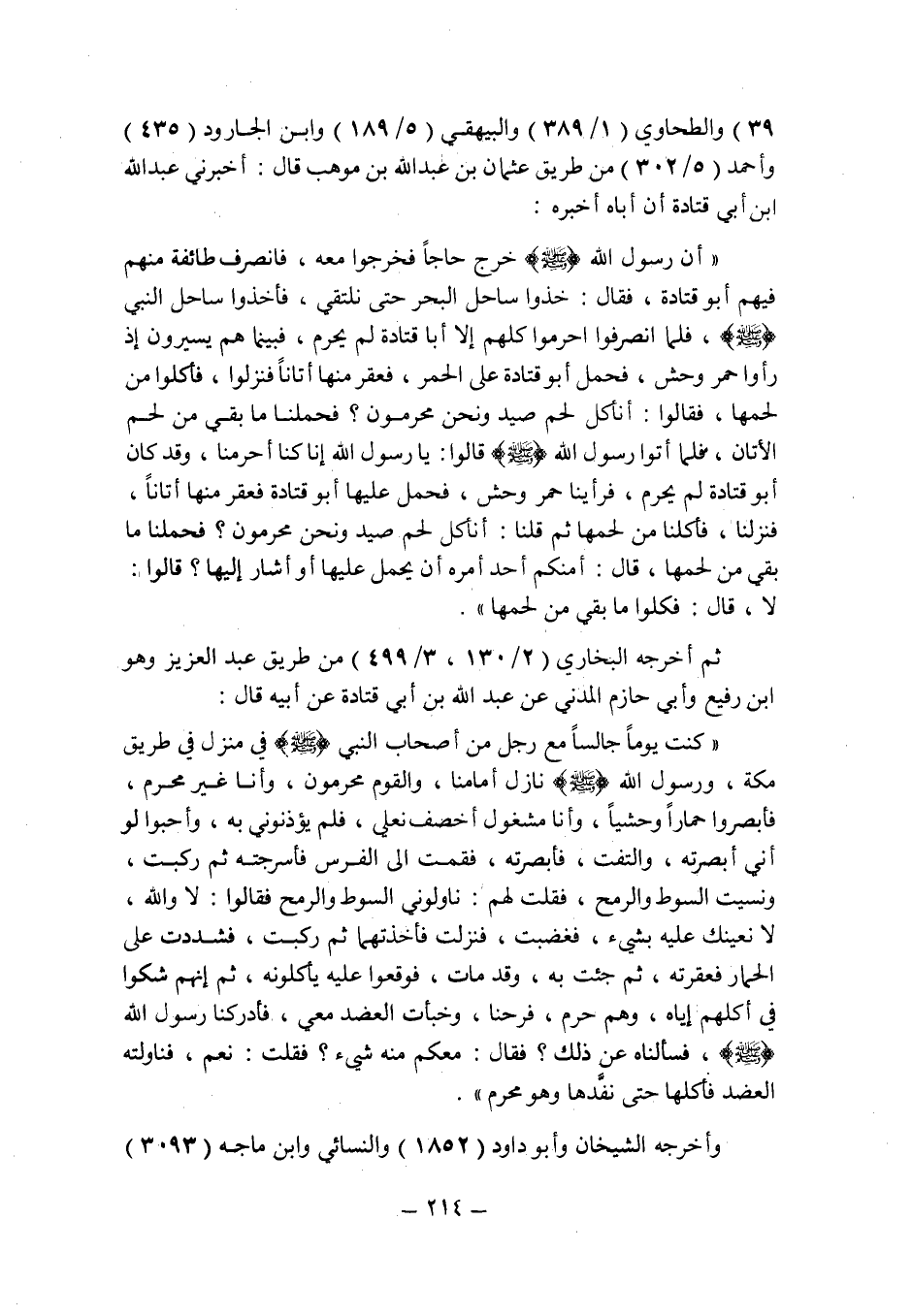 39) والطحاوى (1/389) والبيهقى (5/189) وابن الجارود (435) وأحمد (5/302) من طريق عثمان بن عبد الله بن موهب قال: أخبرنى عبد الله بن أبى قتادة أن أباه أخبره: " أن رسول الله صلى الله عليه وسلم خرج حاجا فخرجوا معه , فانصرف طائفة منهم فيهم أبو قتادة , فقال: خذوا ساحل البحر حتى نلتقى , فأخذوا ساحل (النبى صلى الله عليه وسلم) [1] , فلما انصرفوا أحرموا كلهم إلا أبا قتادة لم يحرم , فبينما هو يسيرون إذ رأوا حمر وحش , فحمل أبو قتادة على الحمر , فعقر منها أتانا فنزلوا , فأكلوا من لحمها , فقالوا: أنأكل لحم صيد ونحن محرمون؟ فحملنا ما بقى من لحم الأتان , فلما أتوا رسول الله صلى الله عليه وسلم قالوا: يا رسول الله إنا كنا أحرمنا , وقد كان أبو قتادة لم يحرم , فرأينا حمر وحش , فحمل عليها أبو قتادة فعقر منها أتانا , فنزلنا , فأكلنا من لحمها ثم قلنا: أنأكل لحم صيد ونحن محرمون؟ فحملنا ما بقى من لحمها , قال: أمنكم أحد أمره أن يحمل عليها أو أشار إليها؟ قالوا: لا , قال: فكلوا ما بقى من لحمها ".