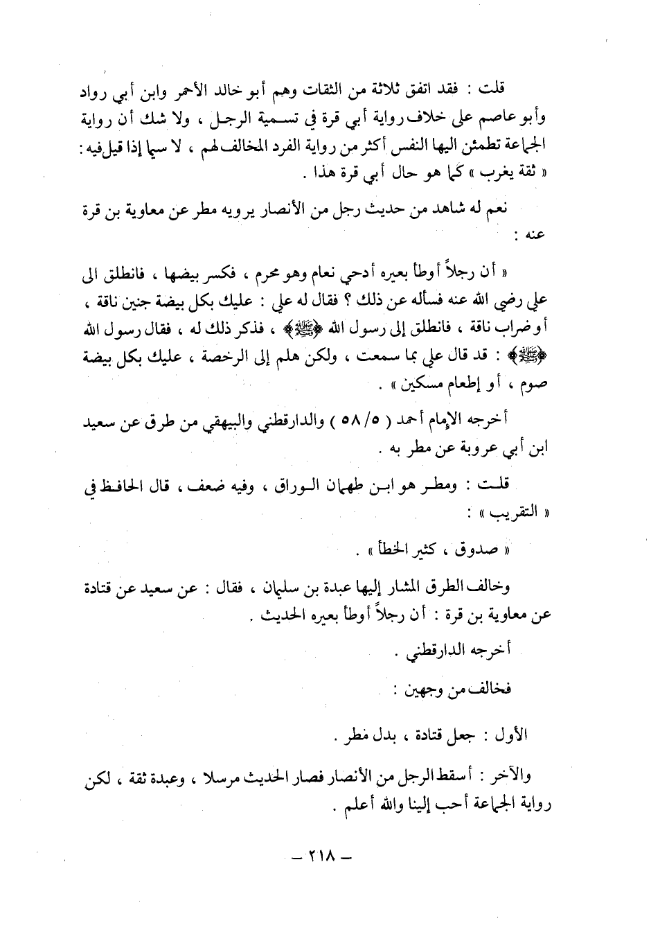 قلت: فقد اتفق ثلاثة من الثقات وهم أبو خالد الأحمر وابن أبى رواد وأبو عاصم على خلاف رواية أبى قرة فى تسمية الرجل , ولا شك أن رواية الجماعة تطمئن إليها النفس أكثر من رواية الفرد المخالف لهم , لا سيما إذا قيل فيه: " ثقة يغرب " كما هو حال أبى قرة هذا.