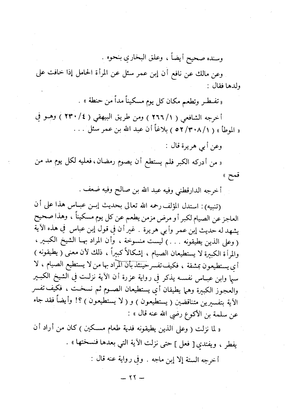 (تنبيه) : استدل المؤلف رحمه الله تعالى بحديث ابن عباس هذا على أن العاجر عن الصيام لكبر أو مرض مزمن يطعم عن كل يوم مسكينا , وهذا صحيح يشهد له حديث ابن عمر وأبى هريرة. غير أن فى قول ابن عباس فى هذه الآية (وعلى الذين يطيقونه ... ) ليست منسوخة , وأن المراد بها الشيخ الكبير , والمرأة الكبيرة لا يستطيعان الصيام , إشكالا كبيرا , ذلك لأن معنى (يطيقونه) أى يستطيعون بمشقة , فكيف تفسر حينئذ بأن المراد بها من لا يستطيع الصيام , لا سيما وابن عباس نفسه يذكر فى رواية عزرة أن الآية نزلت فى الشيخ الكبير والعجوز الكبيرة وهما يطيقان أى يستطيعان الصوم ثم نسخت , فكيف تفسر الآية بتفسيرين متناقضين
