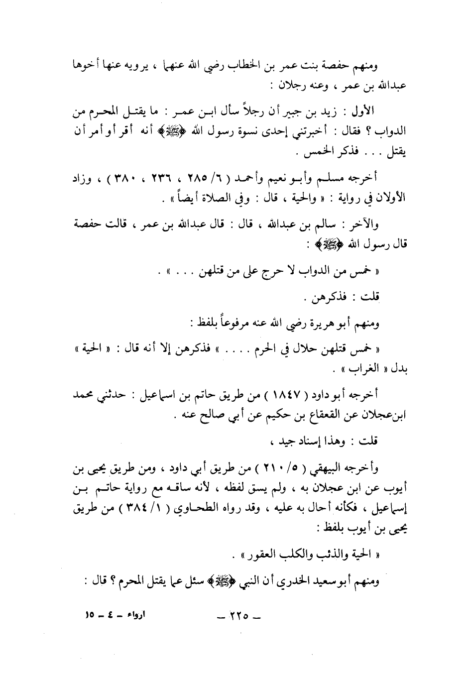الأول: زيد بن جبير أن رجلا سأل ابن عمر: ما يقتل المحرم من الدواب؟ فقال: أخبرتنى إحدى نسوة رسول الله صلى الله عليه وسلم أنه (أقر) [1] أو أمر أن يقتل ... فذكر الخمس.