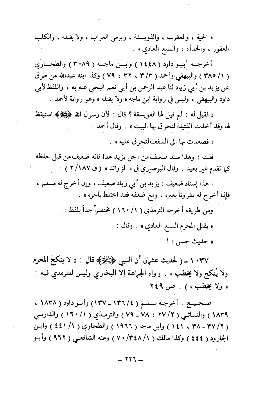 (1037) - (لحديث عثمان أن النبى صلى الله عليه وسلم قال: " لا ينكح المحرم ولا ينكح ولا يخطب ". رواه الجماعة إلا البخارى وليس للترمذى فيه: " ولا يخطب " (ص 249) .