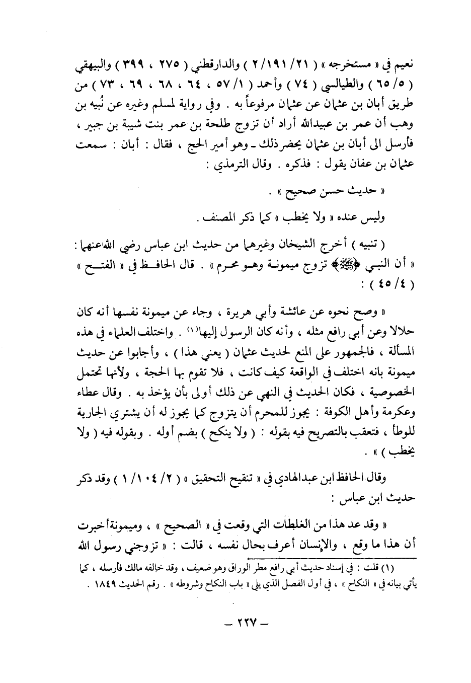 وقال الحافظ ابن عبد الهادى فى " تنقيح التحقيق " (2/104/1) وقد ذكر حديث ابن عباس: " وقد عد هذا من الغلطات التى وقعت فى " الصحيح " , وميمونة أخبرت أن هذا ما وقع , والإنسان أعرف بحال نفسه , قالت: " تزوجنى رسول الله