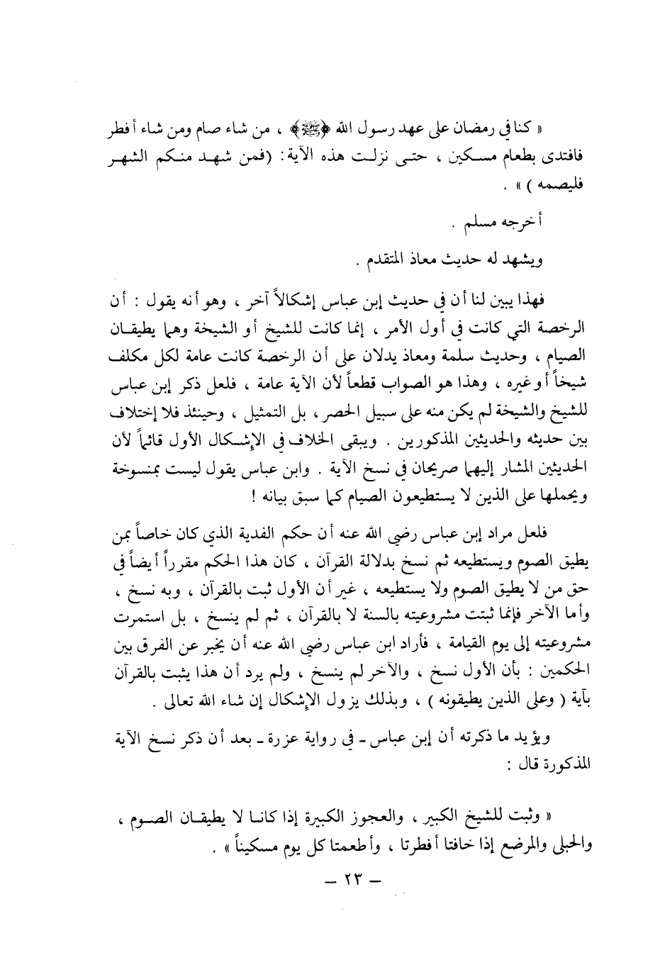 ويبقى الخلاف فى الإشكال الأول قائما لأن الحديثين المشار إليهما صريحان فى نسخ الآية. وابن عباس يقول ليست بمنسوخة ويحملها على الذين لا يستطيعون الصيام كما سبق بيانه!
