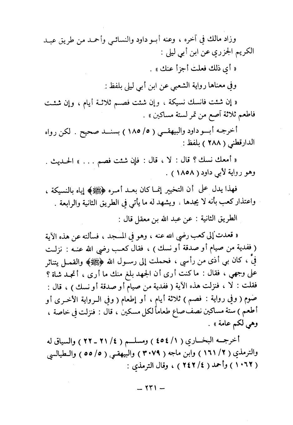 وفى معناها رواية الشعبى عن ابن أبى ليلى بلفظ: " إن شئت فانسك نسيكة , وإن شئت فصم ثلاثة أيام , وإن شئت فأطعم ثلاثة آصع من تمر لستة مساكين ".