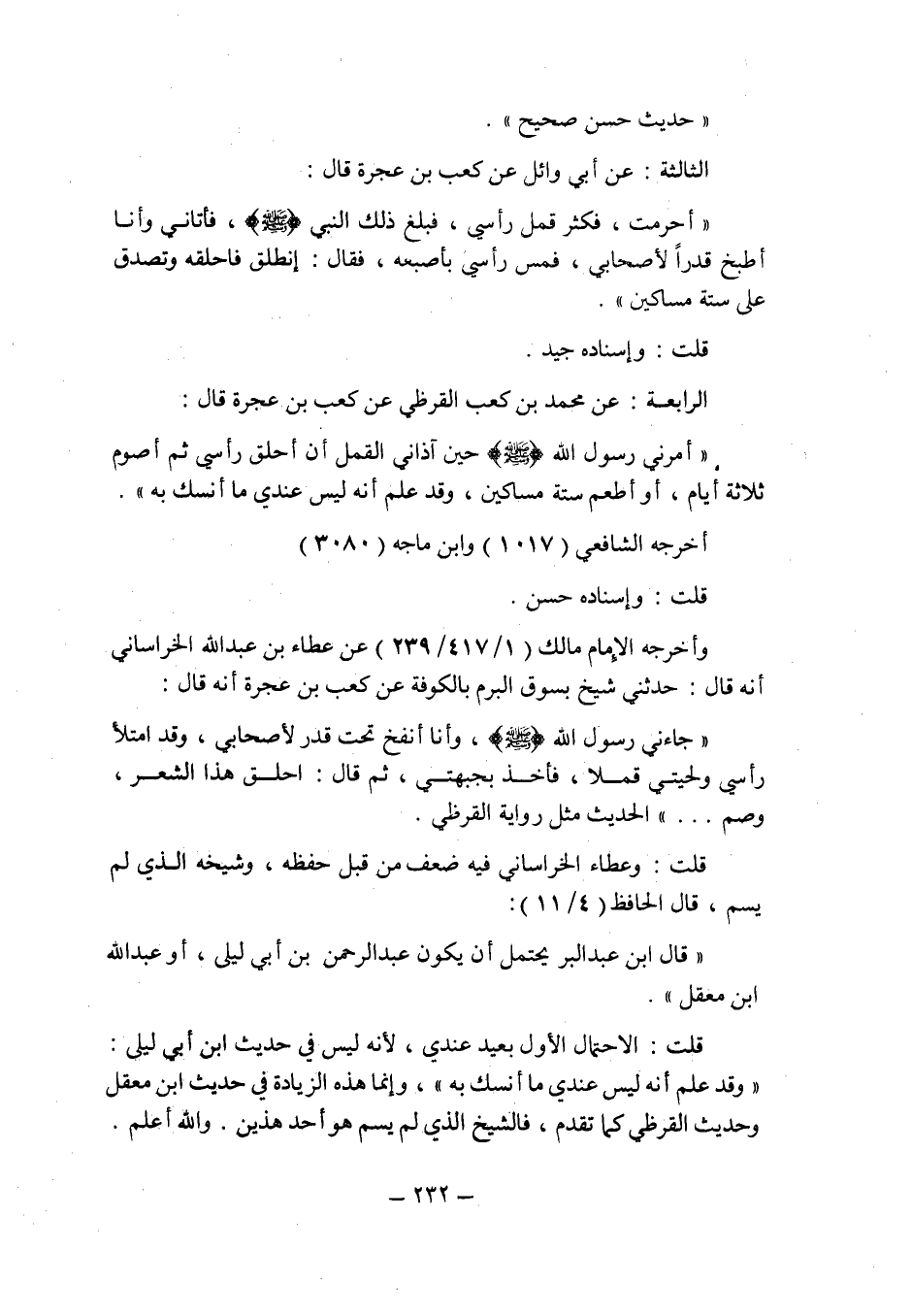 قلت: الاحتمال الأول بعيد عندى , لأنه ليس فى حديث ابن أبى ليلى: " وقد علم أنه ليس عندى ما أنسك به " , وإنما هذه الزيادة فى حديث ابن معقل وحديث القرظى كما تقدم , فالشيخ الذى لم يسم هو أحد هذين , والله أعلم..