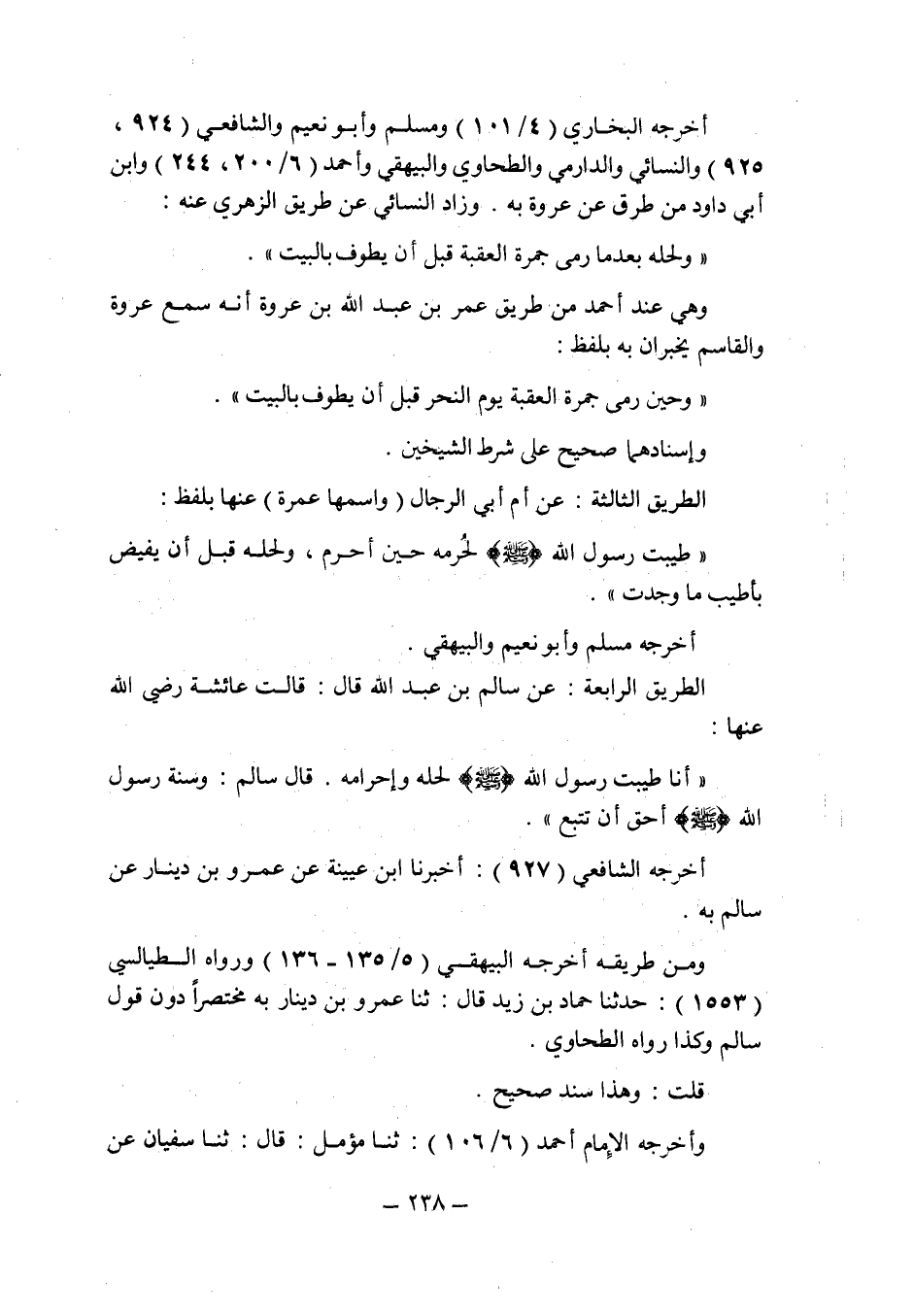 الطريق الرابعة: عن سالم بن عبد الله قال: قالت عائشة رضى الله عنها: " أنا طيبت رسول الله صلى الله عليه وسلم لحله وإحرامه.