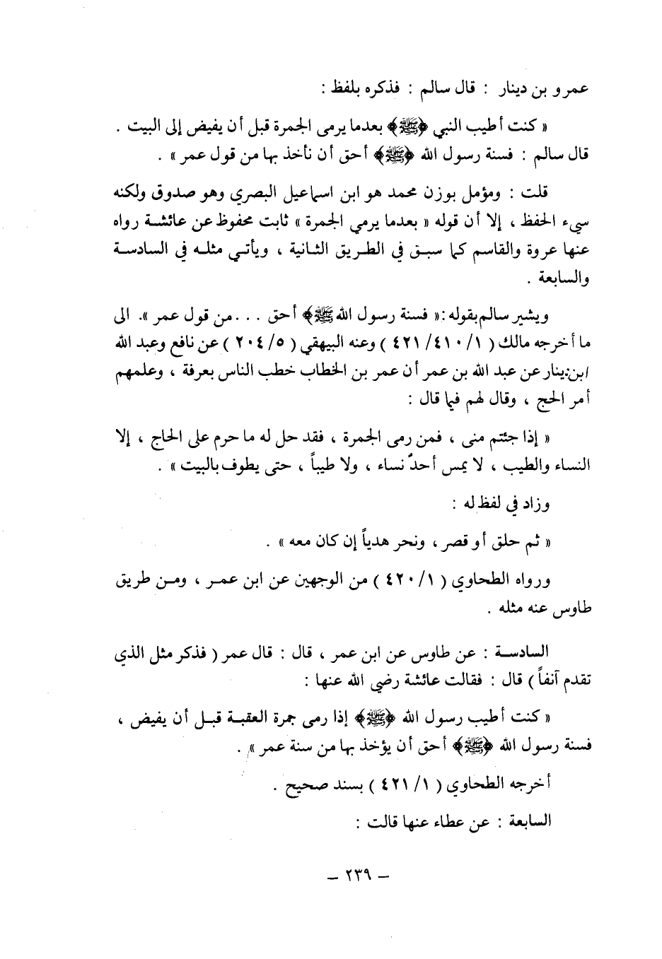 ويشير سالم بقوله: " فسنة رسول الله صلى الله عليه وسلم أحق ... من قول عمر " إلى ما أخرجه مالك (1/410/421) وعنه البيهقى (5/204) عن نافع وعبد الله ابن دينار عن عبد الله بن عمر أن عمر بن الخطاب خطب الناس بعرفة , وعلمهم أمر الحج , وقال لهم فيما قال: " إذا جئتم منى , فمن رمى الجمرة , فقد حل له ما حرم على الحاج , إلا النساء والطيب , لا يمس أحدُنساء , ولا طيباً , حتى يطوف بالبيت ".