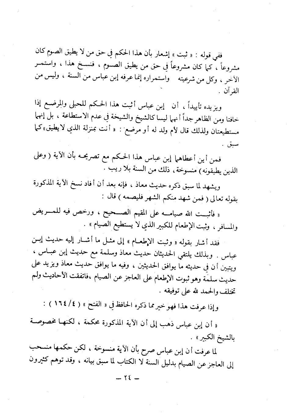 وإذا عرفت هذا فهو خير مما ذكره الحافظ فى " الفتح " (4/164) : " أن ابن عباس ذهب إلى أن الآية المذكورة محكمة , لكنها مخصوصة بالشيخ الكبير " لما عرفت أن ابن عباس صرح بأن الآية منسوخة , لكن حكمها منسحب إلى العاجز عن الصيام بدليل السنة لا الكتاب لما سبق بيانه , وقد توهم كثيرون