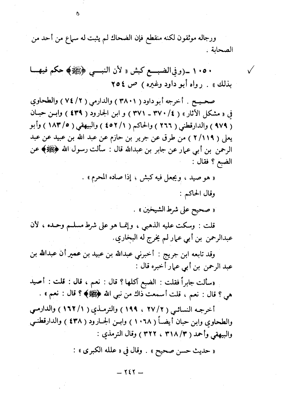 (1050) - ("وفى الضبع كبش ; لأن النبى صلى الله عليه وسلم حكم فيها بذلك ". رواه أبو داود وغيره (ص 254) .