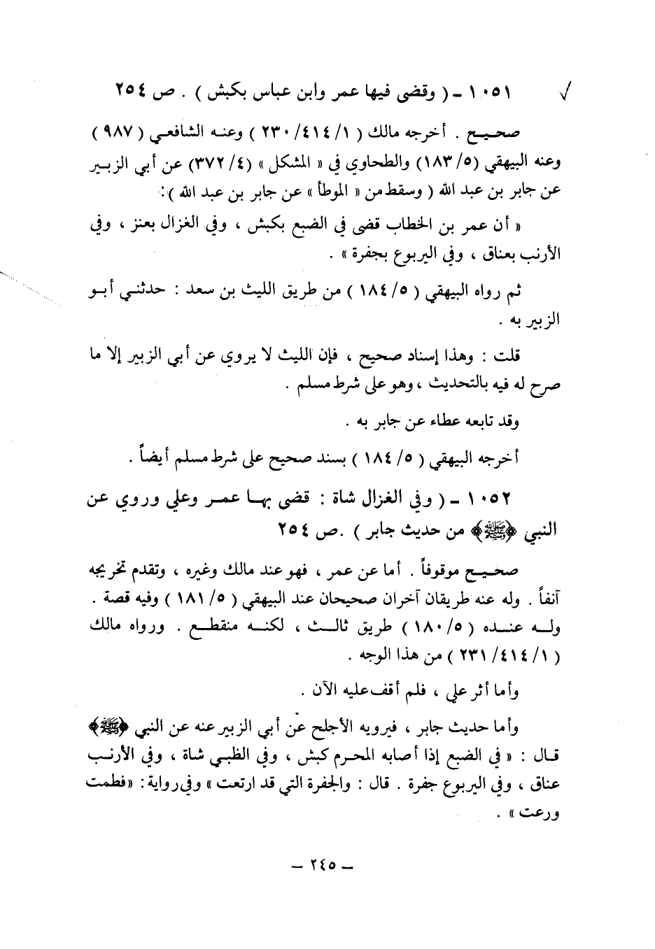 (1052) - (" وفى الغزال شاة: قضى بها عمر وعلى وروى عن النبى صلى الله عليه وسلم من حديث جابر " (ص 254) .