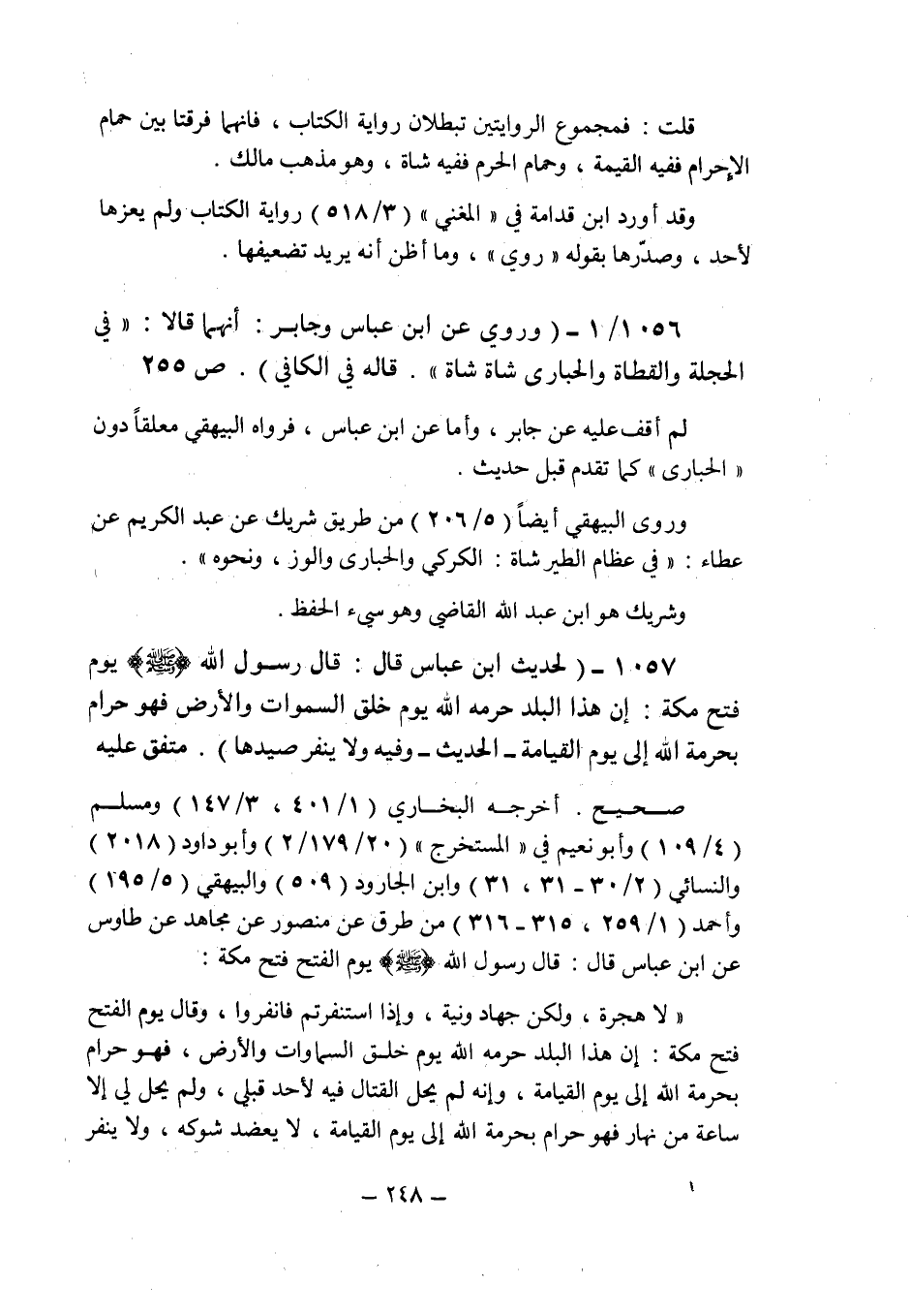 (1056/1) - (" وروي عن ابن عباس وجابر أنهما قالا: "في الحجلة والقطاة والحبارى شاة شاة ". قاله في الكافي) . ص 255