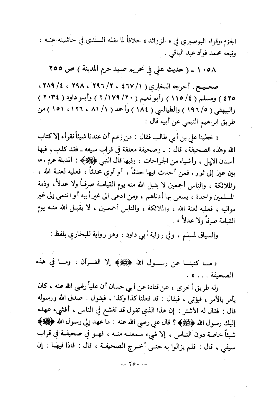 أخرجه البخارى (1/467 , 2/296 , 298 , 4/289 , 425) ومسلم (4/115) وأبو نعيم (20/179/2) وأبو داود (2034) والبيهقى (5/196) والطيالسى (184) وأحمد (1/81 , 126 , 151) من طريق إبراهيم التيمى عن أبيه قال: " خطبنا على بن أبى طالب فقال: من زعم أن عندنا شيئاً نقرأه إلا كتاب الله وهذه الصحيفة , قال: ـ وصحيفة معلقة فى قراب سيفه ـ فقد كذب , فيها أسنان الإبل , وأشياء من الجراحات , وفيها قال النبى صلى الله عليه وسلم: المدينة حرم , ما بين عير إلى ثور , فمن أحدث فيها حدثا , أو آوى محدثاً , فعليه لعنة الله , والملائكة , والناس أجمعين لا يقبل الله منه يوم القيامة صرفا ولا عدلا , وذمة المسلمين واحدة , يسعى بها أدناهم , ومن ادعى إلى غير أبيه أو انتمى إلى غير مواليه , فعليه لعنة الله , والملائكة , والناس أجمعين , لا يقبل الله منه يوم القيامة صرفاً ولا عدلاً ".