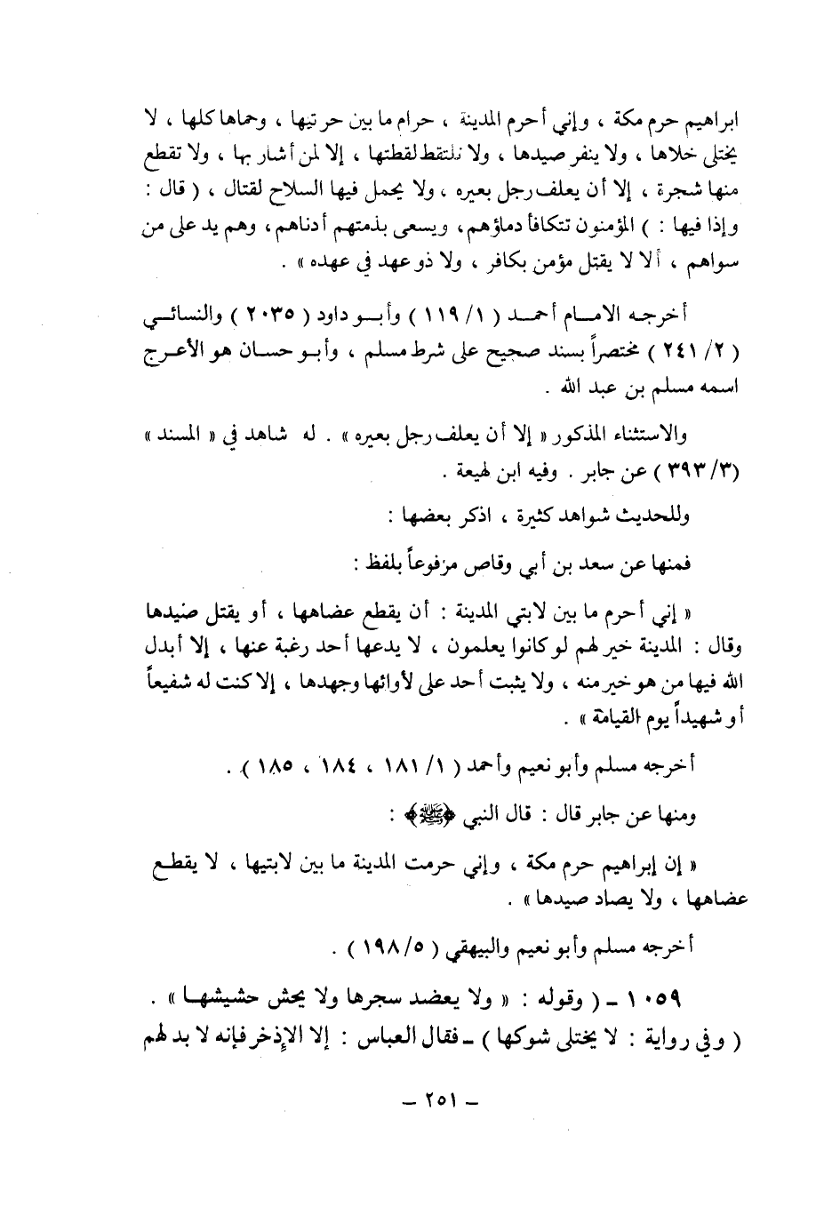 ومنها عن جابر قال: قال النبى صلى الله عليه وسلم: " إن إبراهيم حرم مكة , وإنى حرمت المدينة ما بين لابتيها , لا يقطع عضاهها ,