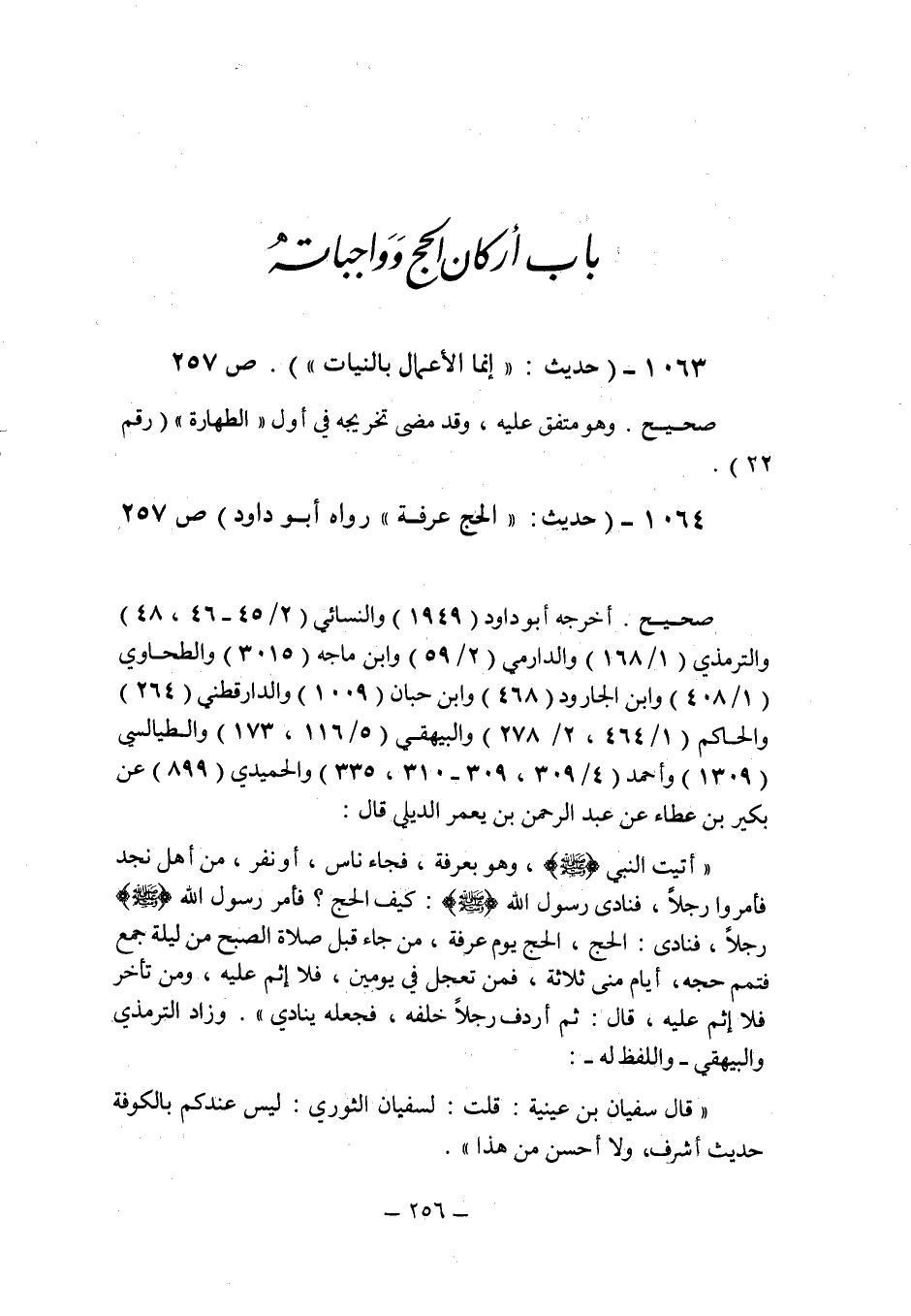 والبيهقى (5/116 , 173) والطيالسى (1309) وأحمد (4/309 , 309 ـ 310 , 335) والحميدى (899) عن بكير بن عطاء عن عبد الرحمن بن يعمر الديلى قال: " أتيت النبى صلى الله عليه وسلم , وهو بعرفة , فجاء ناس , أو نفر , من أهل نجد فأمروا رجلا , فنادى رسول الله صلى الله عليه وسلم: كيف الحج؟ فأمر رسول الله صلى الله عليه وسلم رجلا , فنادى: الحج , الحج يوم عرفة , من جاء قبل صلاة الصبح من ليلة جمع (فتمم) [1] حجه , أيام منى ثلاثة , فمن تعجل فى يومين , فلا إثم عليه ومن تأخر فلا إثم عليه , قال: ثم أردف رجلا خلفه , فجعله ينادى ". وزاد الترمذى والبيهقى - واللفظ له ـ: " قال سفيان بن عينية: قلت لسفيان الثورى: ليس عندكم بالكوفة حديث أشرف , ولا أحسن من هذا ".