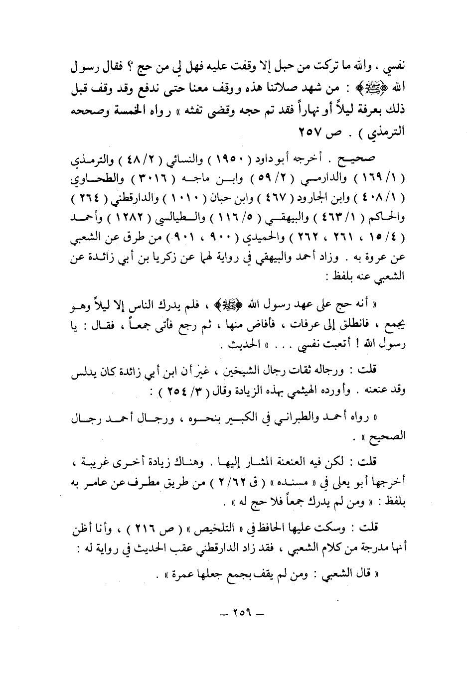 قلت: وسكت عليها الحافظ فى " التلخيص " (ص 216) , وأنا أظن أنها مدرجة من كلام الشعبى , فقد زاد الدارقطنى عقب الحديث فى رواية له: " قال الشعبى: ومن لم يقف بجمع جعلها عمرة ".