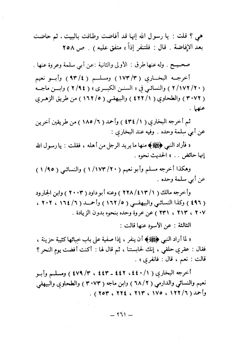 الثالثة: عن الأسود عنها قالت: " لما أراد النبى صلى الله عليه وسلم أن ينفر , إذا صفية على باب خبائها كئيبة حزينة , فقال: عقرى حلقى , إنك لحابستنا , ثم قال لها: أكنت أفضت يوم النحر؟ قالت: نعم , قال: فانفرى ".