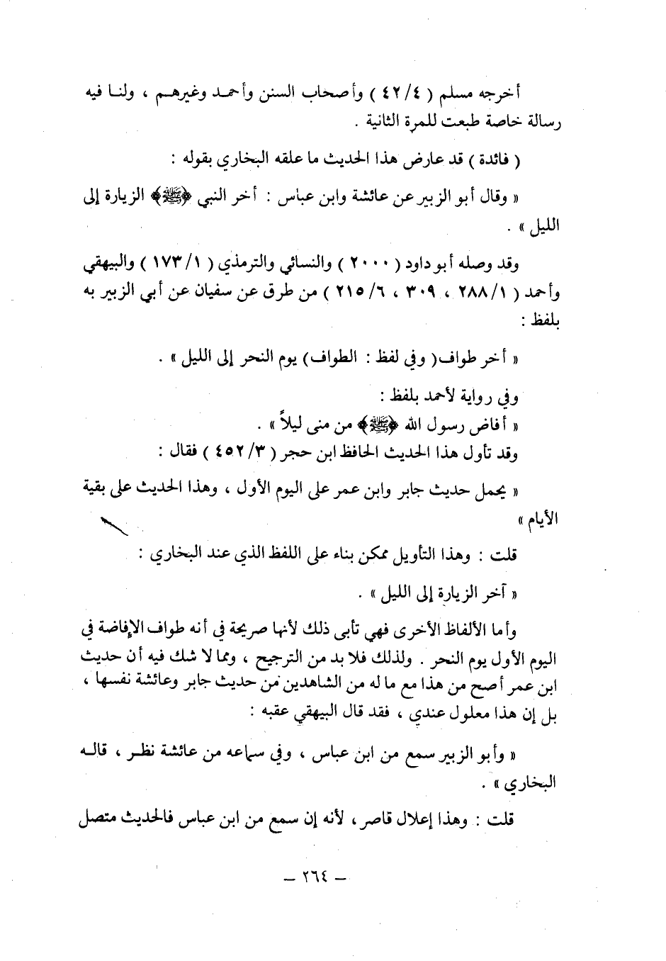 وأما الألفاظ الأخرى فهى تأبى ذلك لأنها صريحة فى أنه طواف الإفاضة فى اليوم الأول يوم النحر ولذلك فلا بد من الترجيح , ومما لا شك فيه أن حديث ابن عمر أصح من هذا مع ما له من الشاهدين من حديث جابر وعائشة نفسها , بل إن هذا معلول عندى , فقد قال البيهقى عقبه: " وأبو الزبير سمع من ابن عباس , وفى سماعه من عائشة نظر , قاله البخارى ".