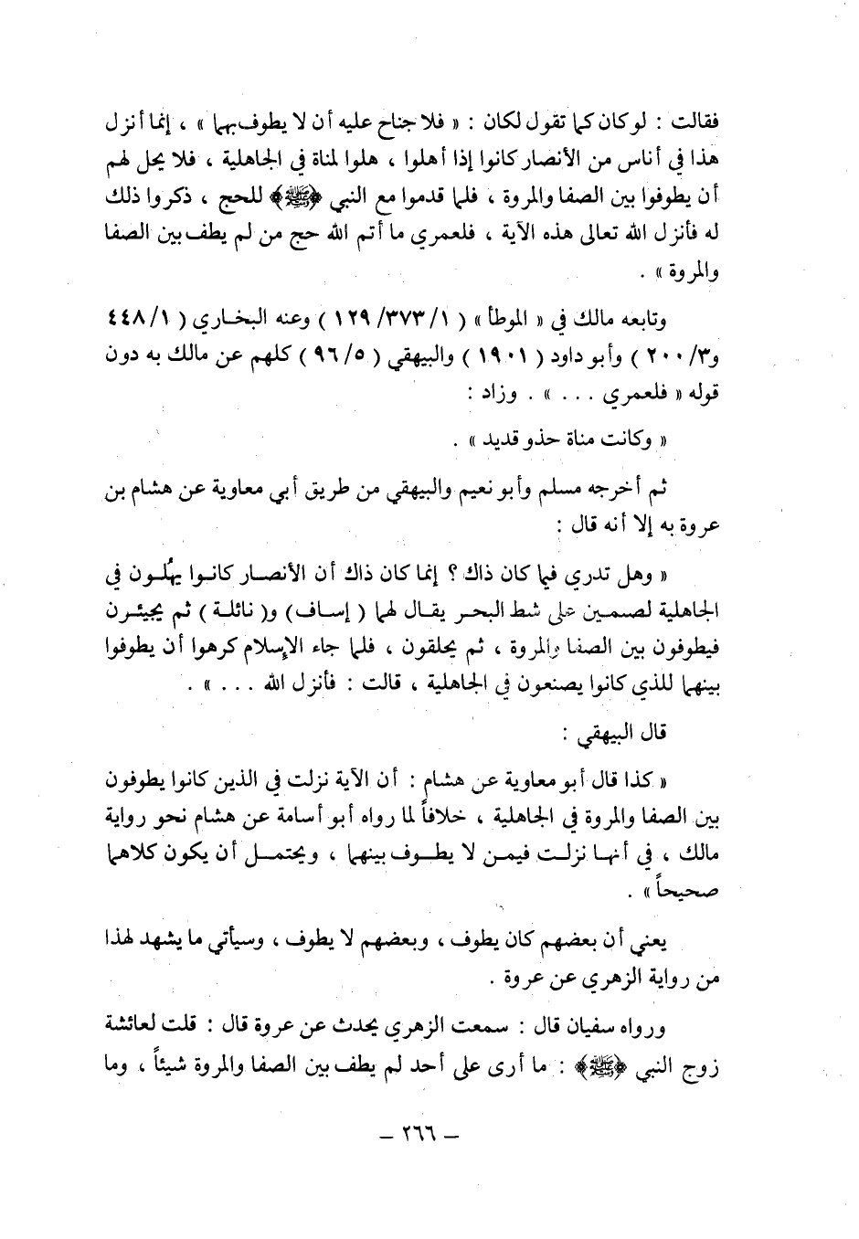 فقالت: لو كان كما تقول لكان: " فلا جناح عليه أن لا يطوف بهما " , إنما أنزل هذا فى أناس من الأنصار كانوا إذا أهلوا , هلوا لمناة فى الجاهلية , فلا يحل لهم أن يطوفوا بين الصفا والمروة , فلما قدموا مع النبى صلى الله عليه وسلم للحج , ذكروا ذلك له فأنزل الله تعالى هذه الآية , فلعمرى ما أتم الله حج من لم يطف بين الصفا والمروة ".