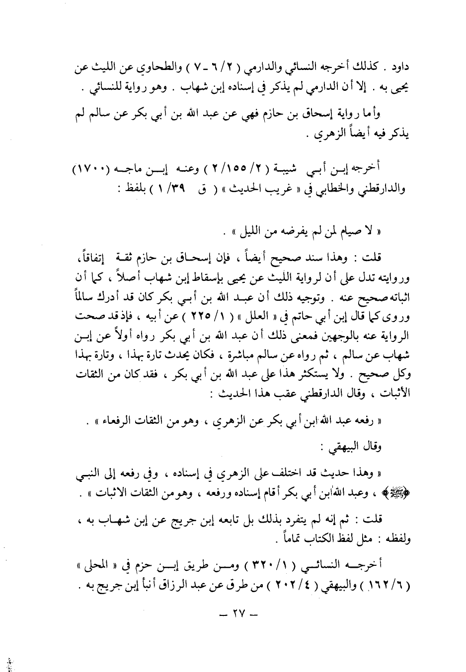 وتوجيه ذلك أن عبد الله بن أبى بكر كان قد أدرك سالما وروى كما قال ابن أبى حاتم فى " العلل " (1/225) عن أبيه , فإذا قد صحت الرواية عنه بالوجهين فمعنى ذلك أن عبد الله بن أبى بكر رواه أولا عن ابن شهاب عن سالم , ثم رواه عن سالم مباشرة , فكان يحدث تارة بهذا , وتارة بهذا وكل صحيح. ولا يستكثر هذا على عبد الله بن أبى بكر , فقد كان من الثقات الأثبات , وقال الدارقطنى عقب