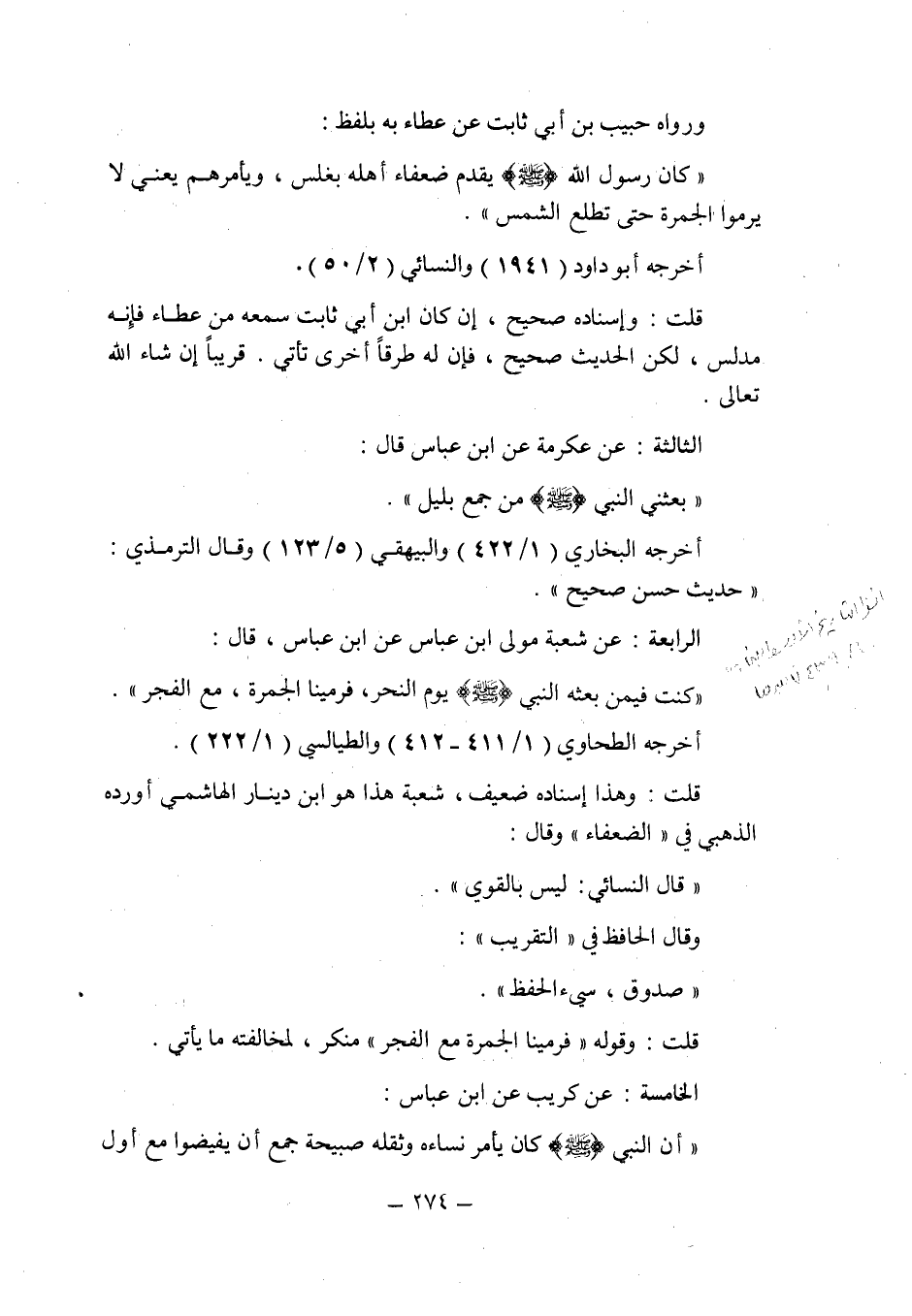 الرابعة: عن شعبة مولى ابن عباس عن ابن عباس , قال: " كنت فيمن بعثه النبى صلى الله عليه وسلم يوم النحر , فرمينا الجمرة , مع الفجر ".