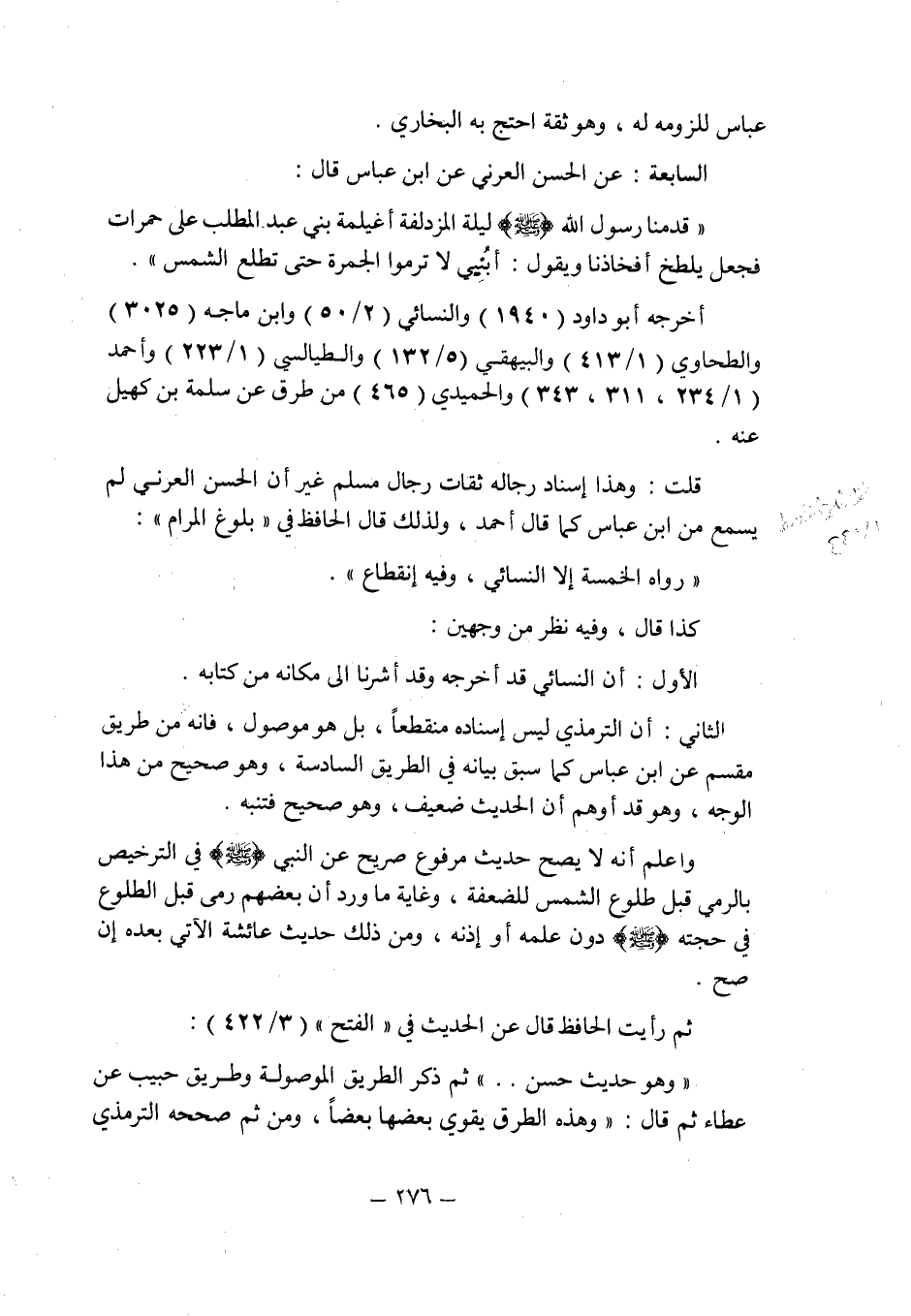 قلت: وهذا إسناد رجاله ثقات رجال مسلم غير أن الحسن العرنى لم يسمع من ابن عباس كما قال أحمد , ولذلك قال الحافظ فى " بلوغ المرام ": " رواه الخمسة إلا النسائى , وفيه انقطاع ".