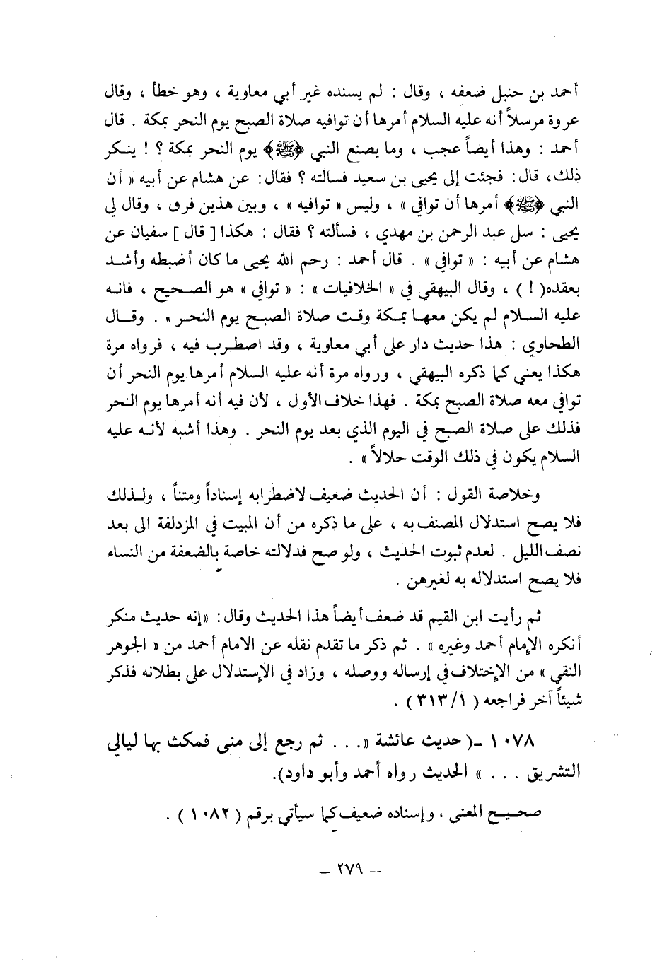 قال أحمد: رحم الله يحيى ما كان أضبطه وأشد بعقده (!) , وقال البيهقى فى " الخلافيات ": " توافى " هو الصحيح , فإنه عليه السلام لم يكن معها بمكة وقت صلاة الصبح يوم النحر.