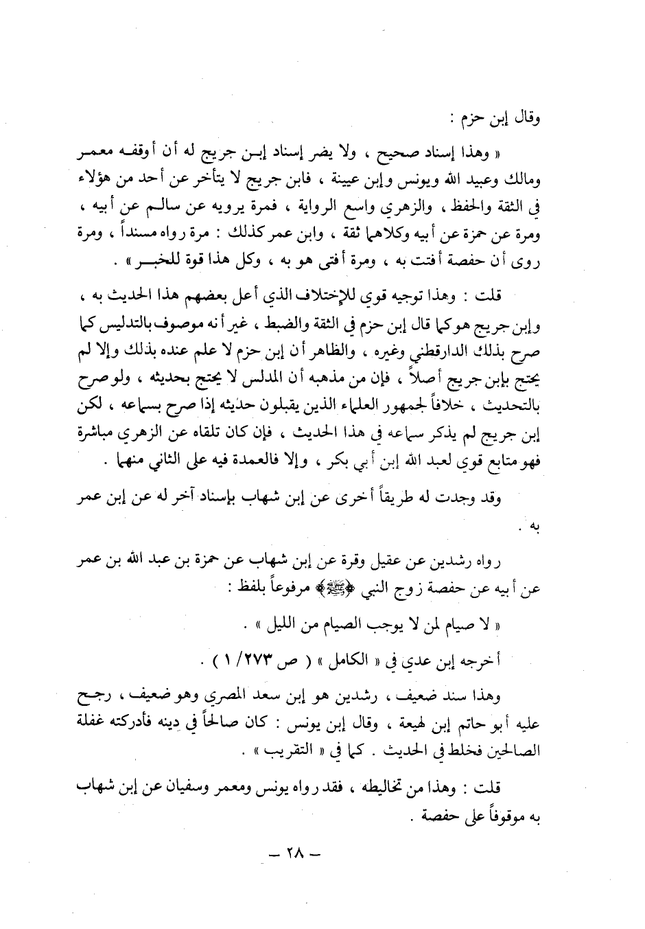 وقال ابن حزم: " وهذا إسناد صحيح , ولا يضر إسناد ابن جريج له أن أوقفه معمر ومالك وعبيد الله ويونس وابن عيينة , فابن جريج لا يتأخر عن أحد من هؤلاء فى الثقة والحفظ , والزهرى واسع الرواية , فمرة يرويه عن سالم عن أبيه , ومرة عن حمزة عن أبيه وكلاهما ثقة , وابن عمر كذلك: مرة رواه مسندا , ومرة روى أن حفصة أفتت به , ومرة أفتى هو به , وكل هذا قوة للخبر ".قلت: وهذا توجيه قوى للاختلاف الذى أعل بعضهم هذا الحديث به , وابن جريج هو كما قال ابن حزم فى الثقة والضبط , غير أنه موصوف بالتدليس كما صرح بذلك الدارقطنى وغيره , والظاهر أن ابن حزم لا علم عنده بذلك وإلا لم يحتج بابن جريج أصلا , فإن من مذهبه أن المدلس لا يحتج بحديثه , ولو صرح بالتحديث , خلافا لجمهور العلماء الذين يقبلون حديثه إذا صرح بسماعه , لكن ابن