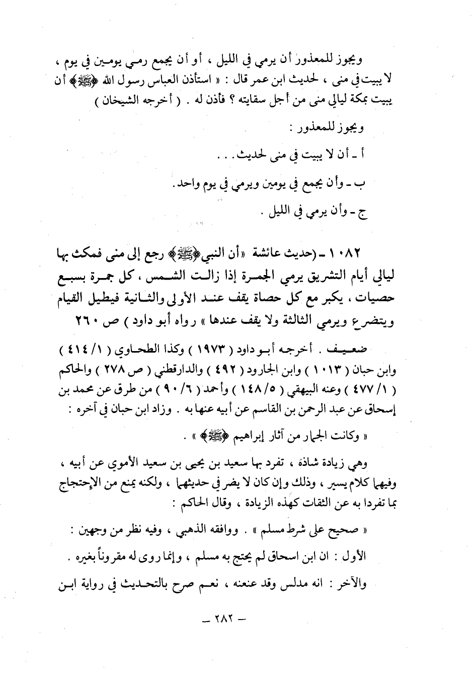 ويجوز للمعذور أن يرمى فى الليل , أو أن يجمع رمى يومين فى يوم , لا يبيت فى منى , لحديث ابن عمر قال: " استأذن العباس رسول الله صلى الله عليه وسلم أن يبيت بمكة ليالى منى من أجل سقايته؟ فأذن له " (أخرجه الشيخان) .