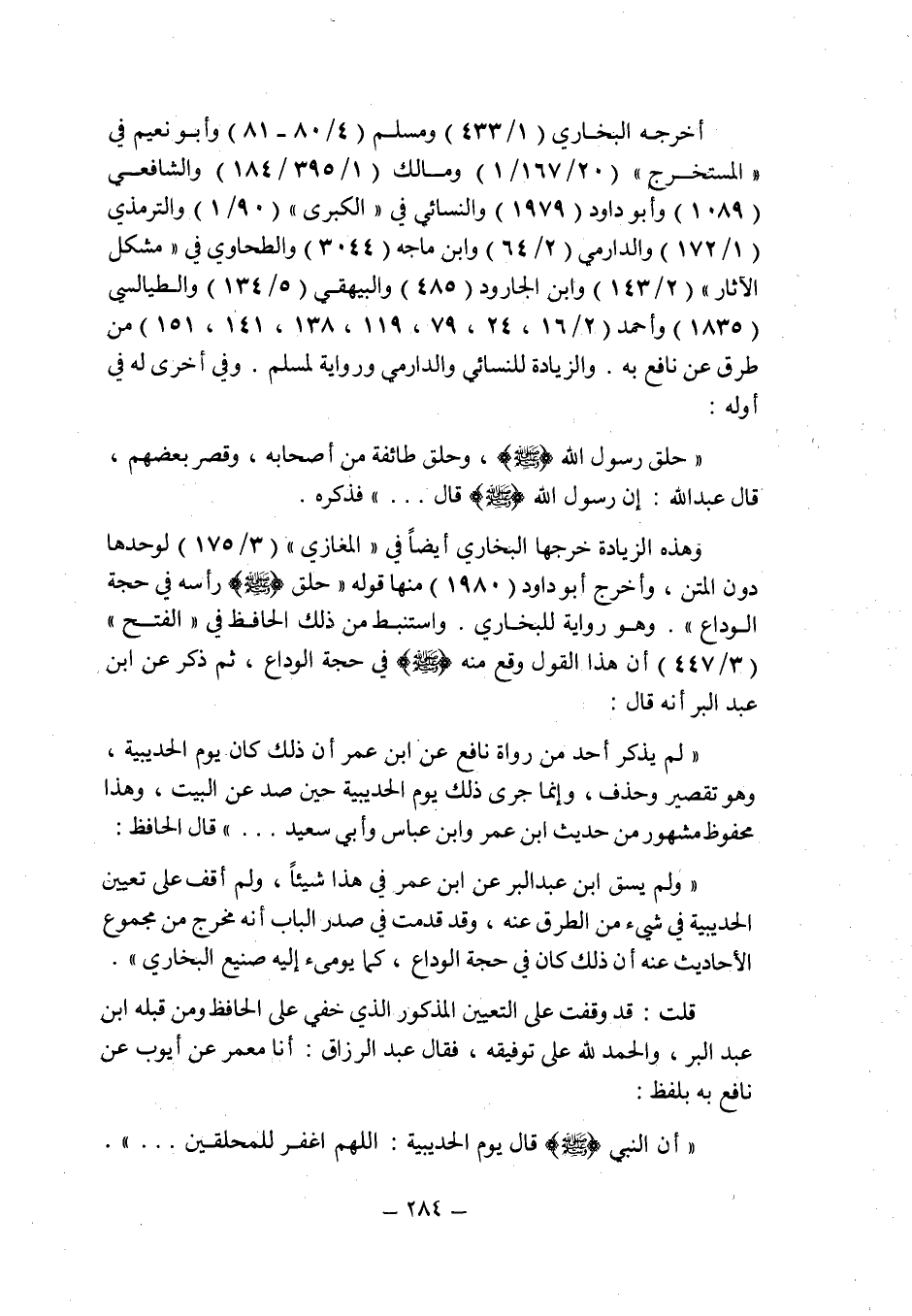 وهذه الزيادة خرجها البخارى أيضا فى " المغازى " (3/175) لوحدها دون المتن , وأخرج أبو داود (1980) منها قوله " حلق صلى الله عليه وسلم رأسه فى حجة الوداع ". وهو رواية للبخارى واستنبط من ذلك الحافظ فى " الفتح " (3/447) أن هذا القول وقع منه صلى الله عليه وسلم فى حجة الوداع , ثم ذكر عن ابن عبد البر أنه قال: " لم يذكر أحد من رواة نافع عن ابن عمر أن ذلك كان يوم الحديبية , وهو تقصير وحذف , وإنما جرى ذلك يوم الحديبية حين صد عن البيت , وهذا محفوظ مشهور من حديث ابن عمر وابن عباس وأبى سعيد ... "
