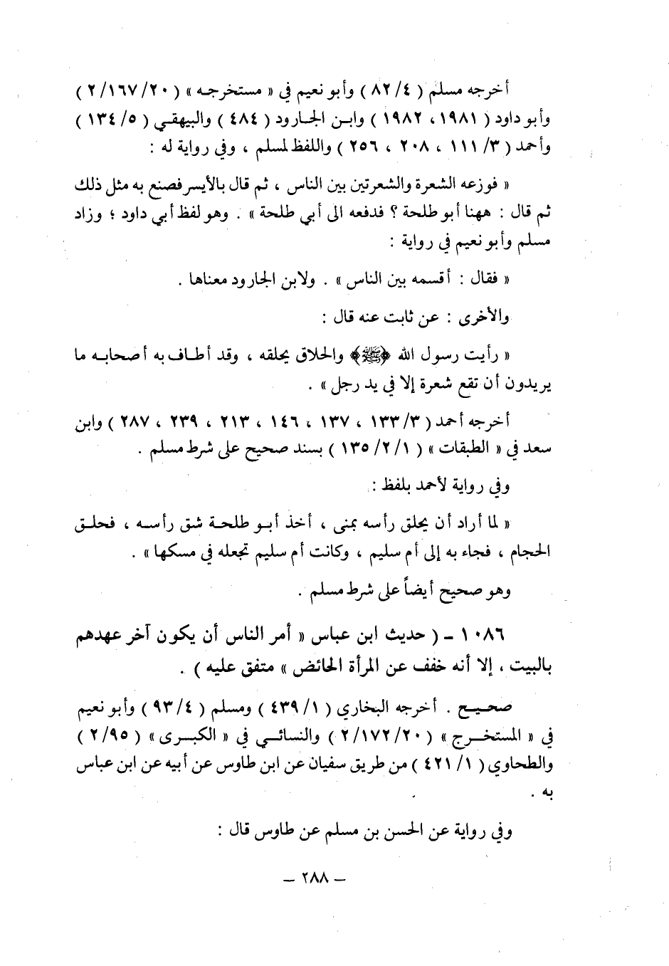 أخرجه مسلم (4/82) وأبو نعيم فى " مستخرجه " (20/167/2) وأبو داود (1981 , 1982) وابن الجارود (484) والبيهقى (5/134) وأحمد (3/111 , 208 , 256) واللفظ لمسلم , وفى رواية له: " فوزعه الشعرة والشعرتين بين الناس , ثم قال بالأيسر فصنع به مثل ذلك ثم قال: ههنا أبو طلحة؟ فدفعه إلى أبى طلحة "