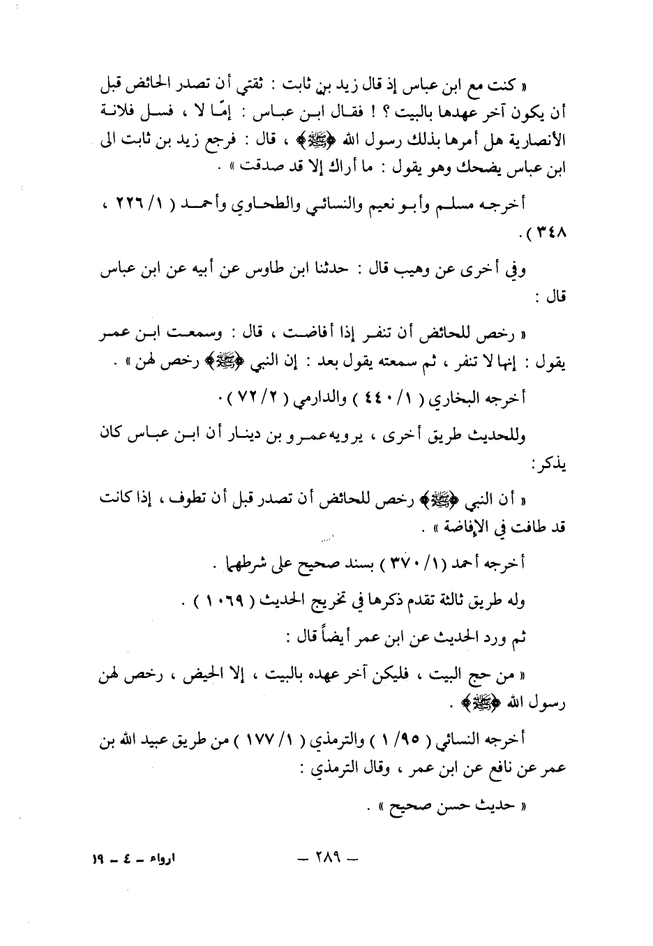 " كنت مع ابن عباس إذ قال زيد بن ثابت: (ثقتى) [1] أن تصدر الحائض قبل أن يكون آخر عهدها بالبيت؟ ! فقال ابن عباس: إما لا , فسل فلانة الأنصارية هل أمرها بذلك رسول الله صلى الله عليه وسلم , قال: فرجع زيد بن ثابت إلى ابن عباس يضحك وهو يقول: ما أراك إلا قد صدقت ".