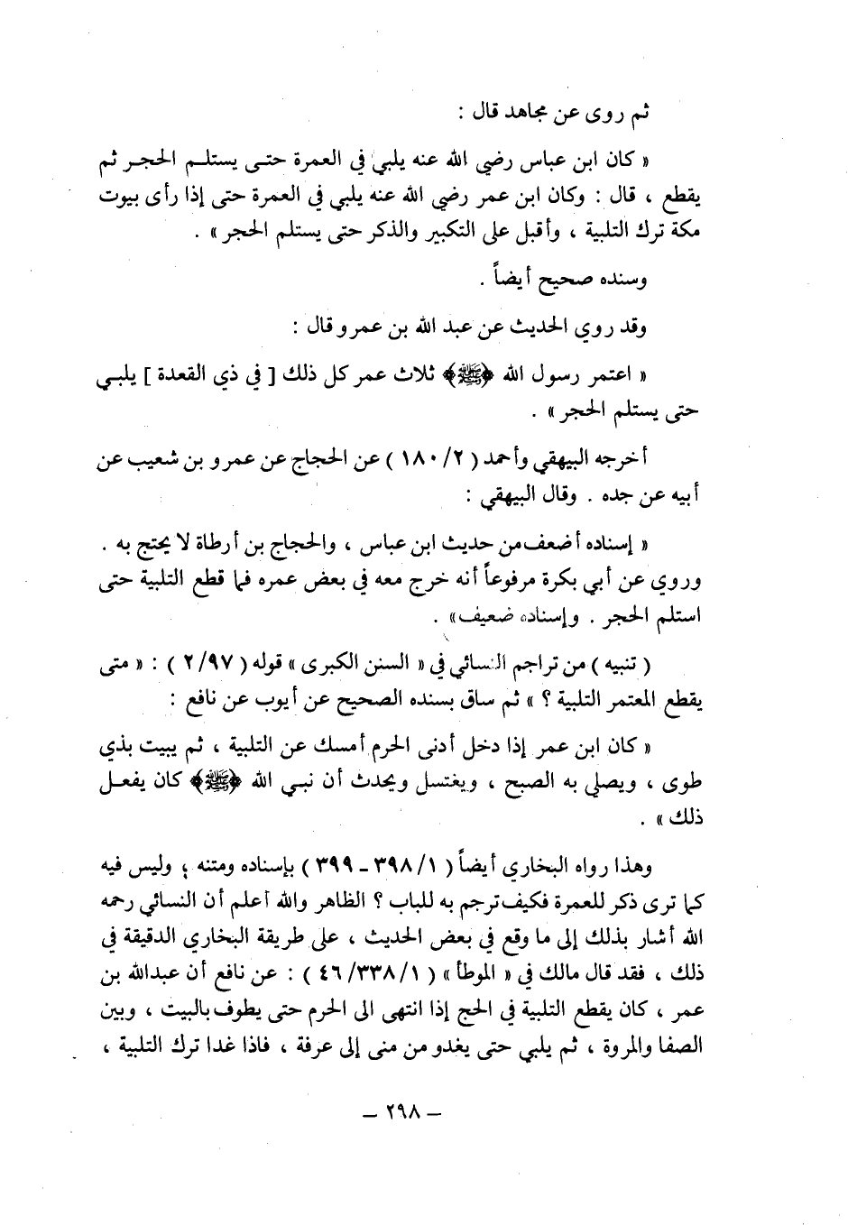 ثم روى عن مجاهد قال: (كان ابن عباس رضي الله عنه يلبي في العمرة حتى يستلم الحجر ثم يقطع قال: وكان ابن عمر رضي الله عنه يلبي في العمرة حتى إذا رأى بيوت مكة ترك التلبية وأقبل على التكبير والذكر حتي يستلم الحجر) . وسنده صحيح أيضا.