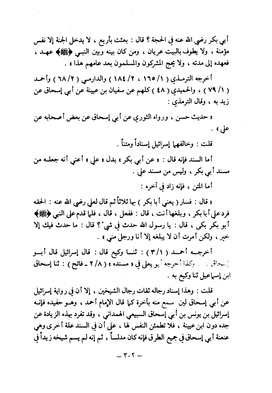 قلت: وهذا إسناد رجاله ثقات رجال الشيخين , إلا أن فى رواية إسرائيل عن أبى إسحاق لين سمع منه بآخرة كما قال الإمام أحمد , وهو حفيده فإنه إسرائيل بن يونس بن أبى إسحاق السبيعى الهمدانى , وقد تفرد بهذه الزيادة عن جده دون ابن عيينة , فلا تطمئن النفس لها , على أن فى السند علة أخرى وهى عنعنة أبى إسحاق فى جميع الطرق فإنه كان مدلسا , ثم إنه لم يسم شيخه زيدا فى