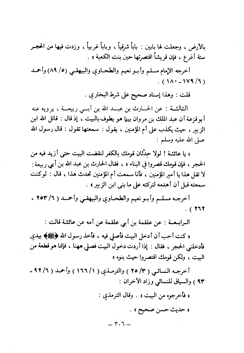 الرابعة: عن علقمة بن أبى علقمة عن أمه عن عائشة قالت: " كنت أحب أن أدخل البيت فأصلى فيه , فأخذ رسول الله صلى الله عليه وسلم بيدى فأدخلنى الحجر , فقال: إذا أردت دخول البيت فصلى ههنا , فإنما هو قطعة من البيت , ولكن قومك اقتصروا حيث بنوه ".