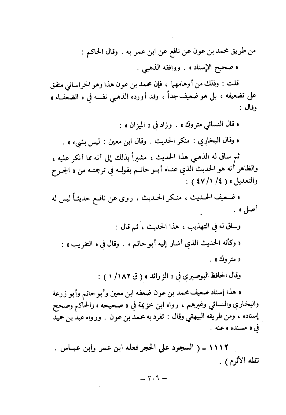 قلت: وذلك من أوهامهما , فإن محمد بن عون هذا وهو الخراسانى متفق على تضعيفه , بل هو ضعيف جدا , وقد أورده الذهبى نفسه فى " الضعفاء " وقال: " قال النسائى متروك ". وزاد فى " الميزان ": " وقال البخارى: منكر الحديث.