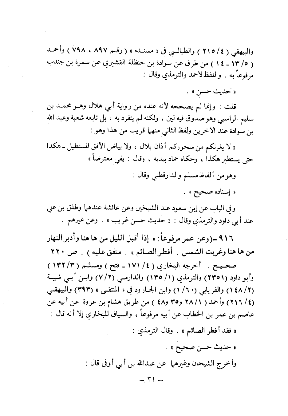قلت: وإنما لم يصححه لأنه عنده من رواية أبى هلال وهو محمد بن سليم الراسبى وهو صدوق فيه لين , ولكنه لم يتفرد به , بل تابعه شعبة وعبد الله بن سوادة عند الآخرين ولفظ الثانى منهما قريب من هذا هو: " لا يغرنكم من سحوركم أذان بلال , ولا بياض الأفق المستطيل ـ هكذا حتى يستطير هكذا , وحكاه حماد بيديه , وقال: يفي [1] معترضا "