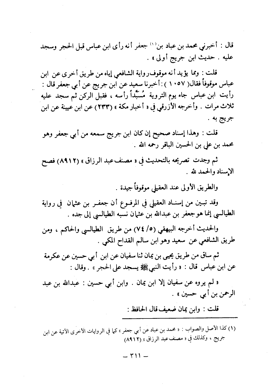 قال: أخبرنى محمد بن عباد بن (1) جعفر أنه رأى ابن عباس قبل الحجر وسجد عليه. حديث ابن جريج أولى ".