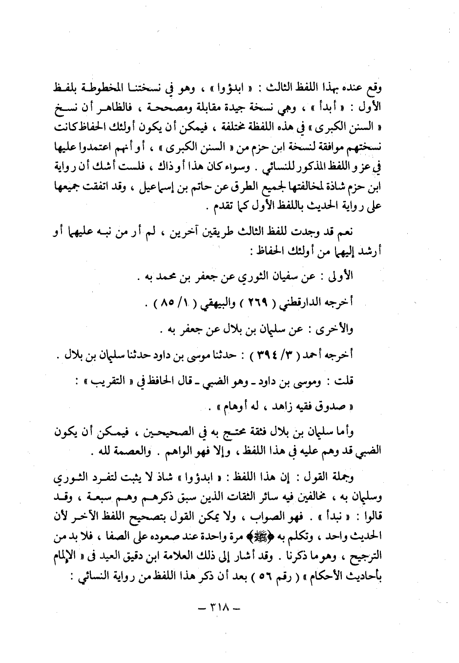 وجملة القول: إن هذا اللفظ: " ابدءوا " شاذ لا يثبت لتفرد الثورى وسليمان به , مخالفين فيه سائر الثقات الذين سبق ذكرهم وهم سبعة , وقد قالوا: " نبدأ ". فهو الصواب , ولا يمكن القول بتصحيح اللفظ الآخر لأن الحديث واحد , وتكلم به صلى الله عليه وسلم مرة واحدة عند صعوده على الصفا , فلا بد من الترجيح , وهو ما ذكرنا. وقد أشار إلى ذلك العلامة ابن دقيق العيد فى " الإلمام بأحاديث الأحكام " (رقم 56) بعد أن ذكر هذا اللفظ من رواية النسائى: