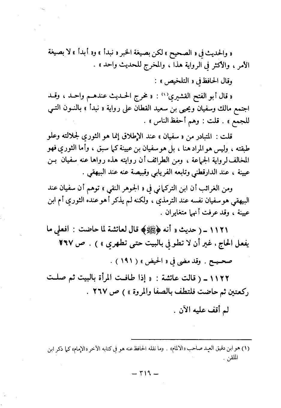 (1) هو ابن دقيق العيد صاحب " الإلمام " وما نقله الحافظ عنه هو فى كتابه الآخر " الإمام " كما ذكر ابن الملقن.Qقال صاحب التكميل ص / 47: