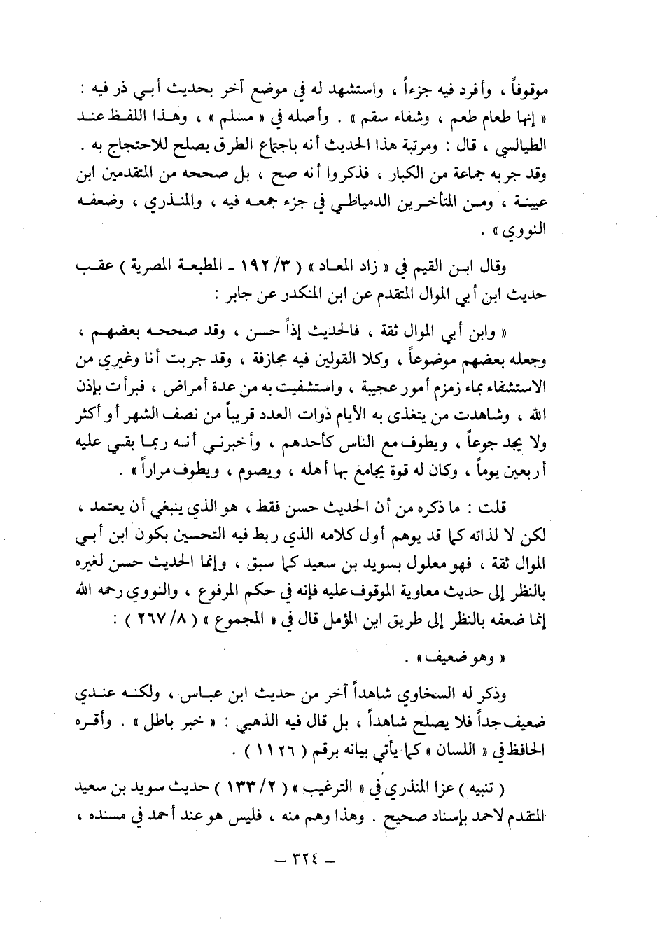 قلت: ما ذكره من أن الحديث حسن فقط , هو الذى ينبغى أن يعتمد , لكن لا لذاته كما قد يوهم أول كلامه الذى ربط فيه التحسين بكون ابن أبى الموال ثقة , فهو معلول بسويد بن سعيد كما سبق , وإنما الحديث حسن لغيره بالنظر إلى حديث معاوية الموقوف عليه فإنه فى حكم المرفوع , والنووى رحمه الله إنما ضعفه بالنظر إلى طريق ابن المؤمل قال فى " المجموع " (8/267) : " وهو ضعيف ".