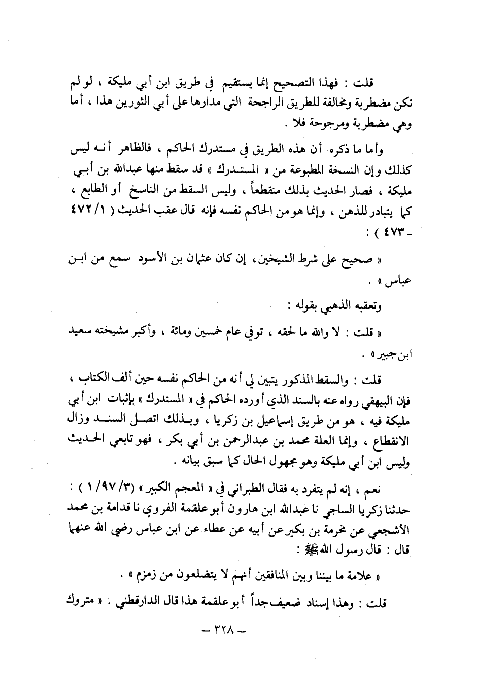 وأما ما ذكره أن هذه الطريق فى مستدرك الحاكم , فالظاهر أنه ليس كذلك وإن النسخة المطبوعة من " المستدرك " قد سقط منها عبد الله بن أبى مليكة , فصار الحديث بذلك منقطعا , وليس السقط من الناسخ أو الطابع , كما يتبادر للذهن , وإنما هو من الحاكم نفسه فإنه قال عقب الحديث (1/472 ـ 473) : " صحيح على شرط الشيخين , إن كان عثمان بن الأسود سمع من ابن عباس ".