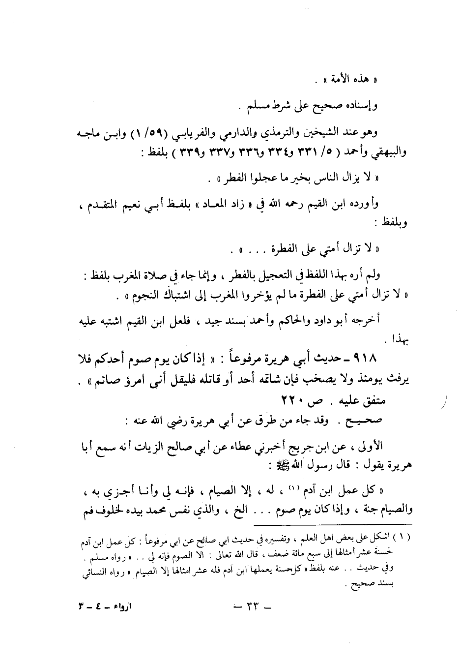 (918) - (حديث أبى هريرة مرفوعا: " إذا كان يوم صوم أحدكم فلا يرفث يومئذ ولا يصخب فإنه شاتمه أحد أو قاتله فليقل أنى امرؤ صائم " متفق عليه (ص 220) .
