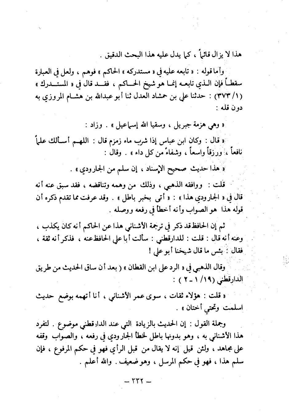 وأما قوله: " تابعه عليه فى " مستدركه " الحاكم " فوهم , ولعل فى العبارة سقطا فإن الذى تابعه إنما هو شيخ الحاكم , فقد قال فى " المستدرك " (1/373) : حدثنا على بن حمشاد العدل حدثنا أبو عبد الله بن هشام المروزى به دون قله: " وهى هزمة جبريل , وسقيا الله إسماعيل ". وزاد: " قال: وكان ابن عباس إذا شرب ماء زمزم قال: اللهم أسألك علما نافعا , ورزقا واسعا , وشفاء من كل داء ".