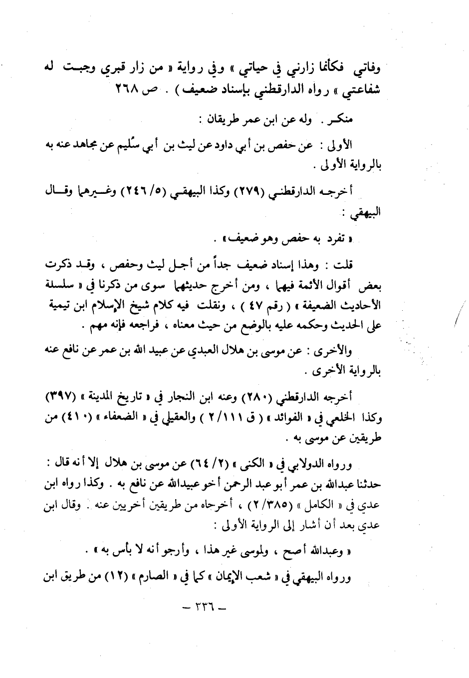 وفاتى فكأنما زارنى فى حياتى ". وفى رواية: " من زار قبرى وجبت له شفاعتى ". رواه الدارقطنى بإسناد ضعيف (ص 268) .