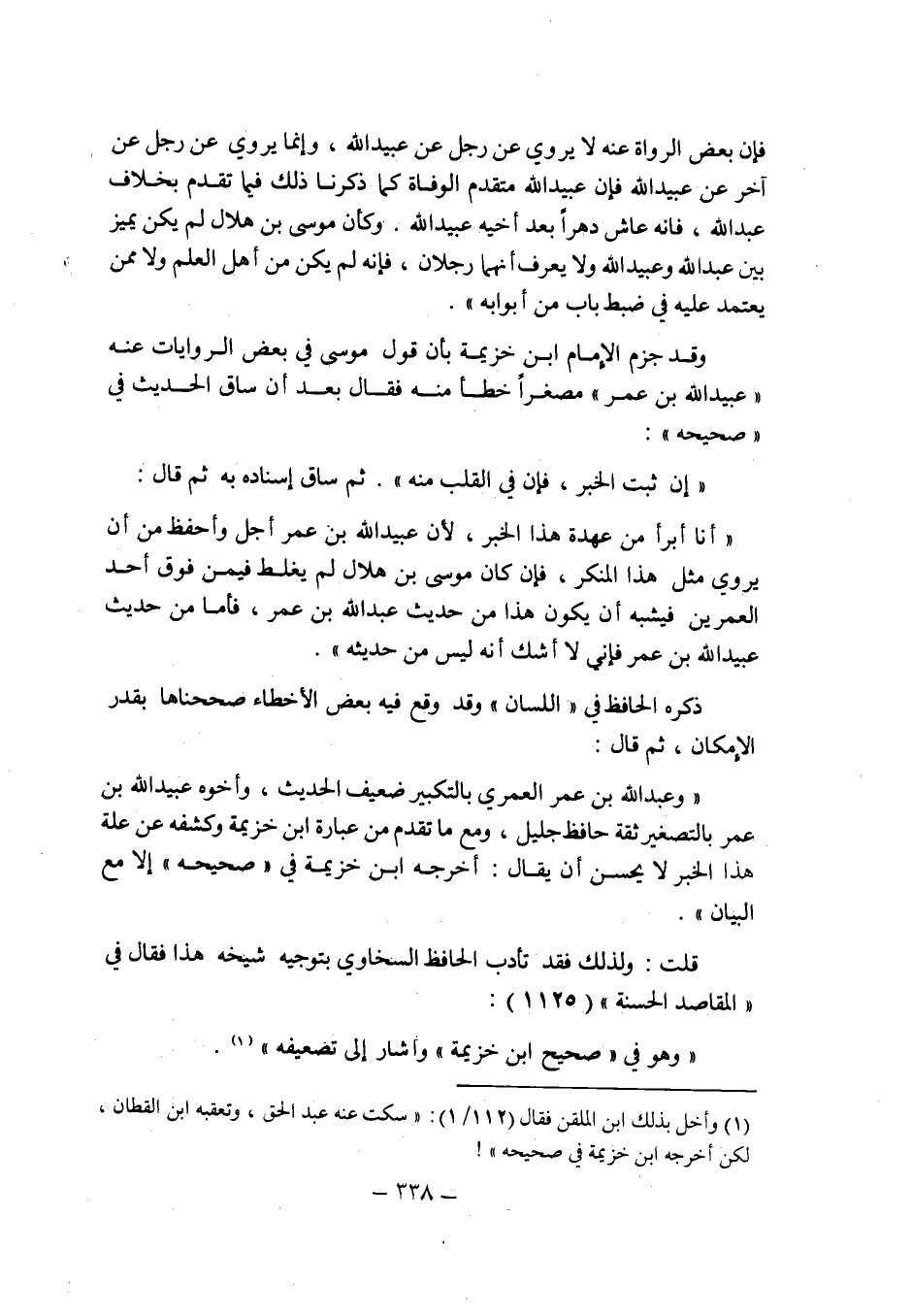 ذكره الحافظ فى " اللسان " وقد وقع فيه بعض الأخطاء صححناها بقدر الإمكان , ثم قال: " وعبد الله بن عمر العمرى بالتكبير ضعيف الحديث , وأخوه عبيد الله بن عمر بالتصغير ثقة حافظ جليل , ومع ما تقدم من عبارة ابن خزيمة وكشفه عن علة هذا الخبر لا يحسن أن يقال: أخرجه ابن خزيمة فى " صحيحه " إلا مع البيان ".