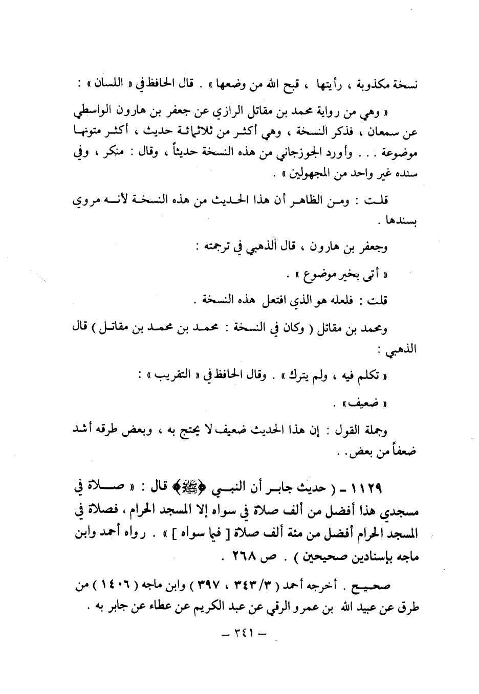 (1129) - (حديث جابر أن النبى صلى الله عليه وسلم قال: " صلاة فى مسجدى هذا أفضل من ألف صلاة فى سواه إلا المسجد الحرام , فصلاة فى المسجد الحرام أفضل من مئة ألف صلاة [فيما سواه] ". رواه أحمد وابن ماجه بإسنادين صحيحين (ص 268) .